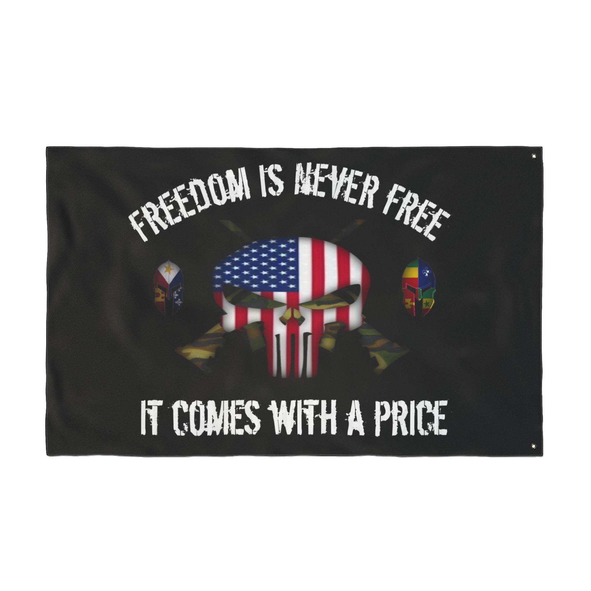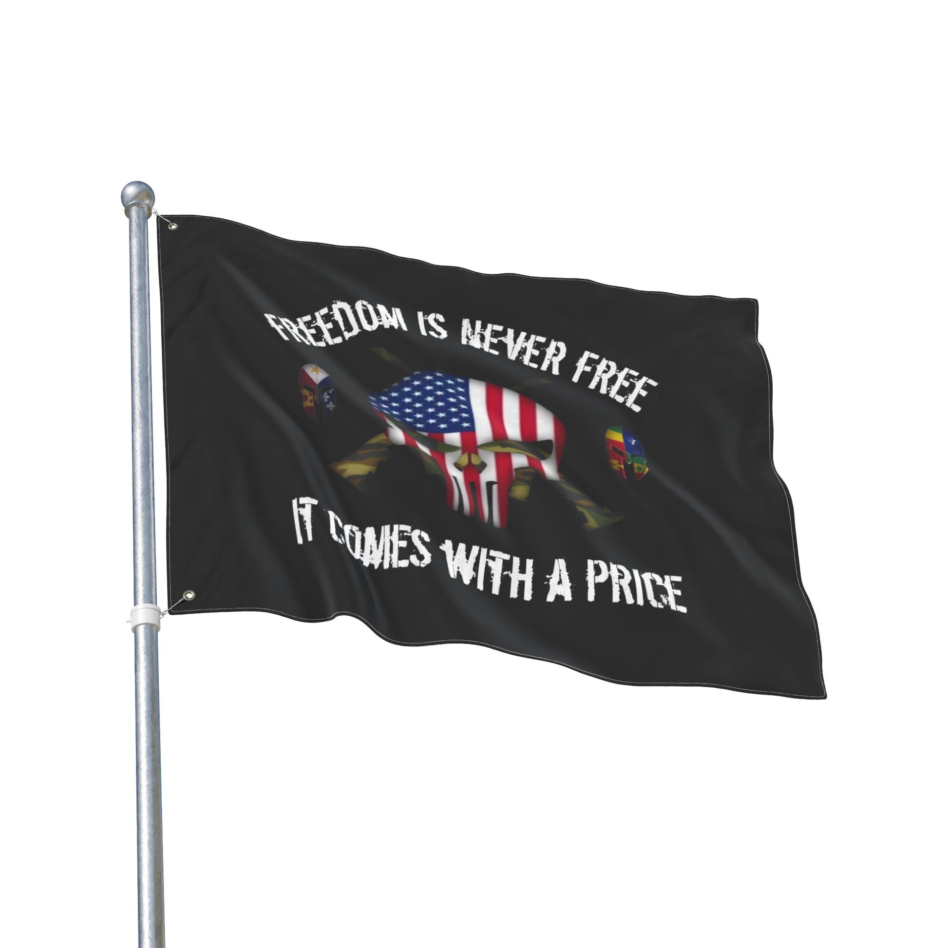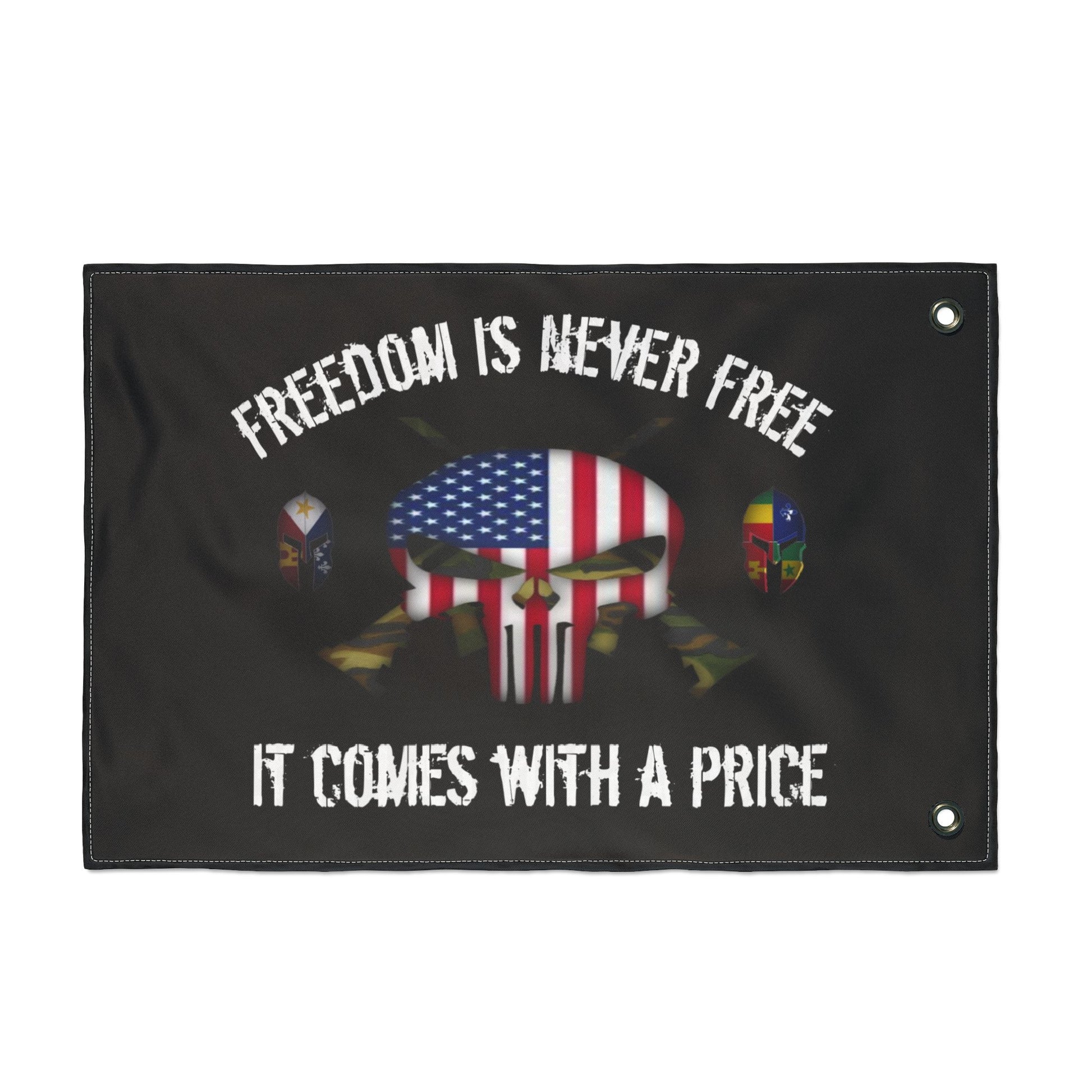 This double sided flag features a punisher skull design and patriotic theme, symbolizing the price of freedom. It is lightweight, vibrant in colors, and made of 100% polyester fibers, perfect for any patriotic individual looking to display their pride.