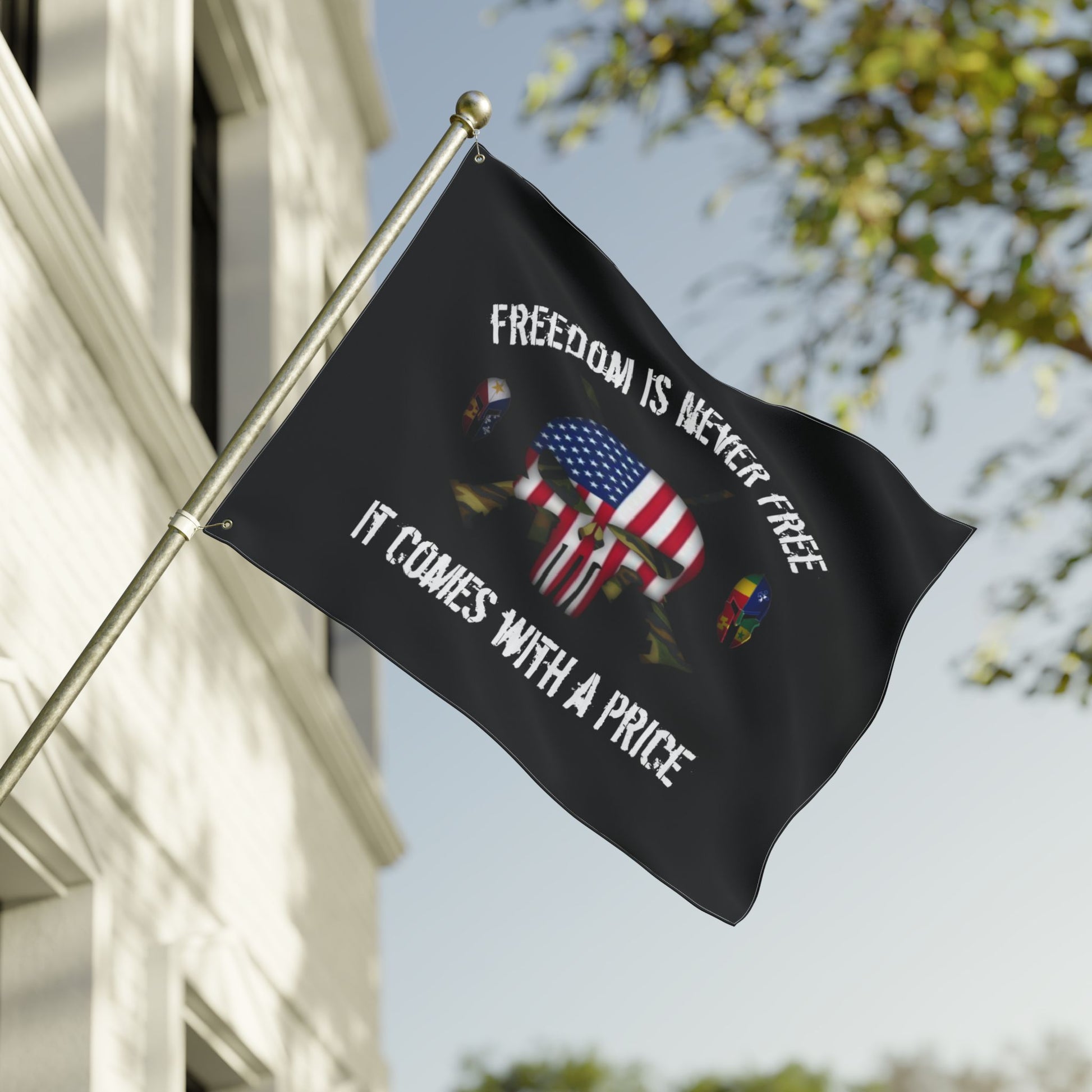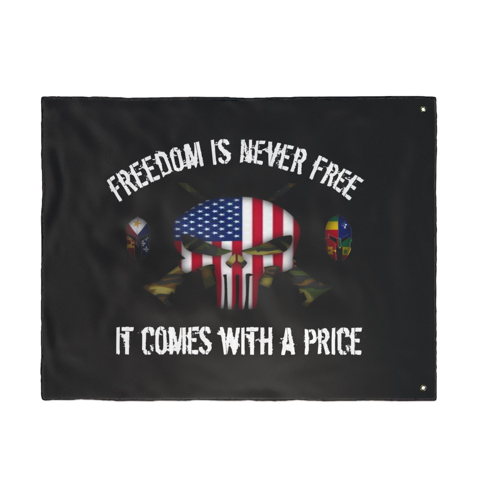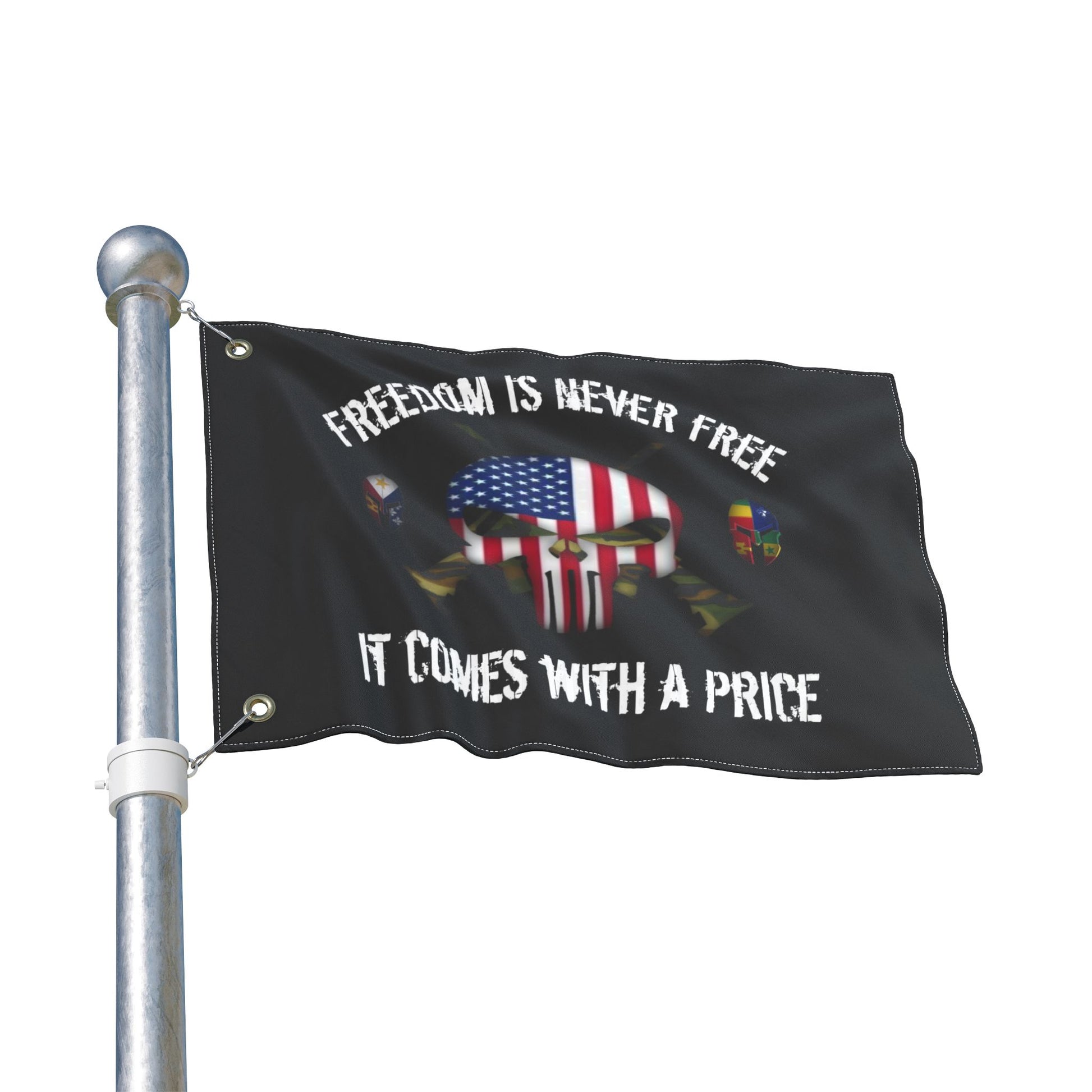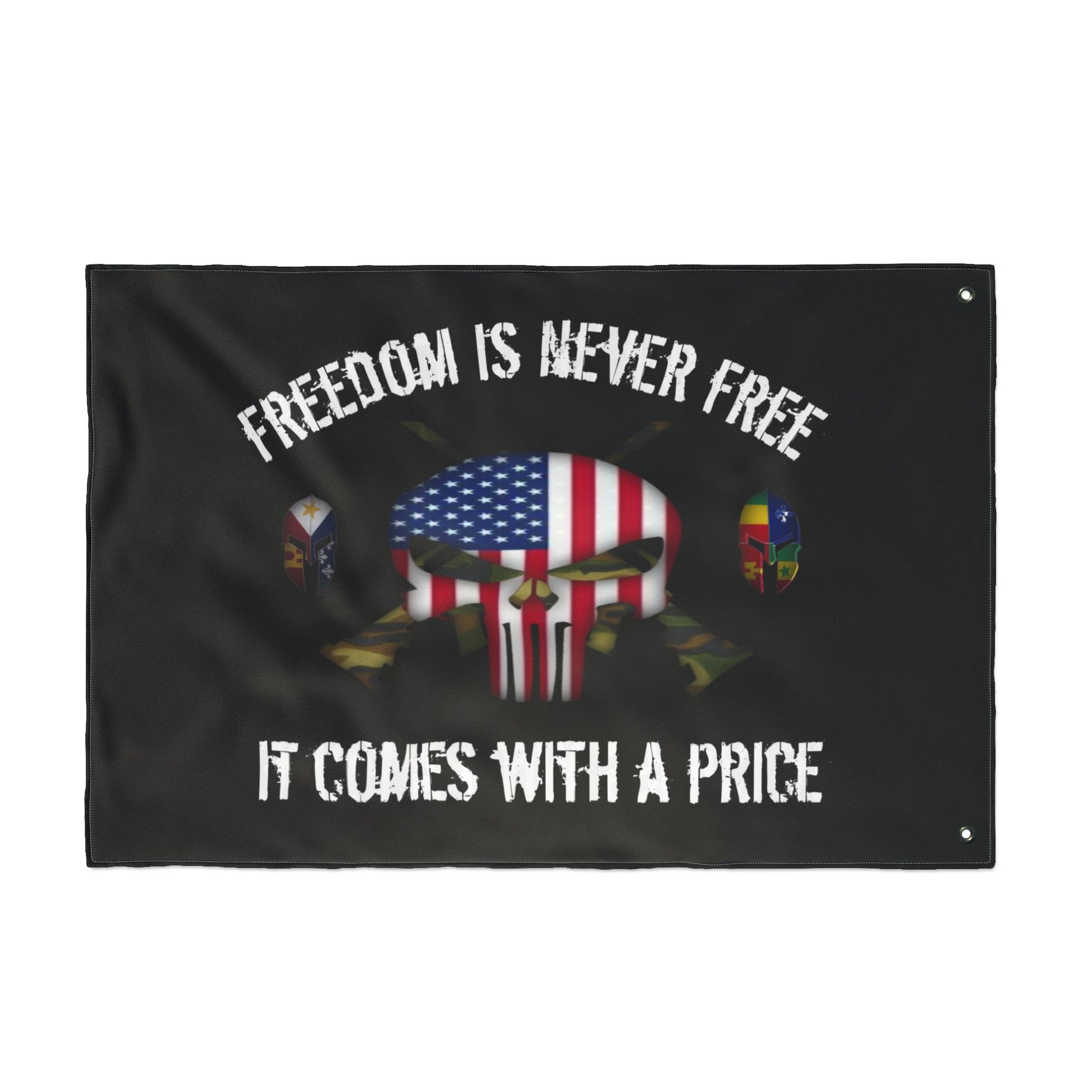 This double sided flag features a punisher skull design and patriotic theme, symbolizing the price of freedom. It is lightweight, vibrant in colors, and made of 100% polyester fibers, perfect for any patriotic individual looking to display their pride.